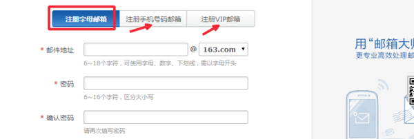 3、點(diǎn)擊后進(jìn)入網(wǎng)易郵箱注冊(cè)頁面,其中有注冊(cè)字母郵箱、注冊(cè)手機(jī)號(hào)碼郵箱、以及VIP郵箱,我們可以根據(jù)需要任選其一,例如注冊(cè)字母郵箱;