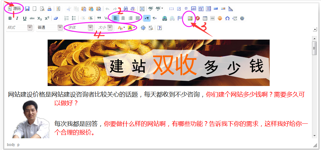 內(nèi)容編輯時常用到的功能,圖1源碼編輯需要一定的基礎(chǔ),在插入視頻代碼時會用到,圖2為文字或者圖片居中,圖三為插入圖片,B為加粗,圖4為文字的 字體、大小顏色、背景色等,其他功能可以鼠標(biāo)移上去停留下可以顯示提示。